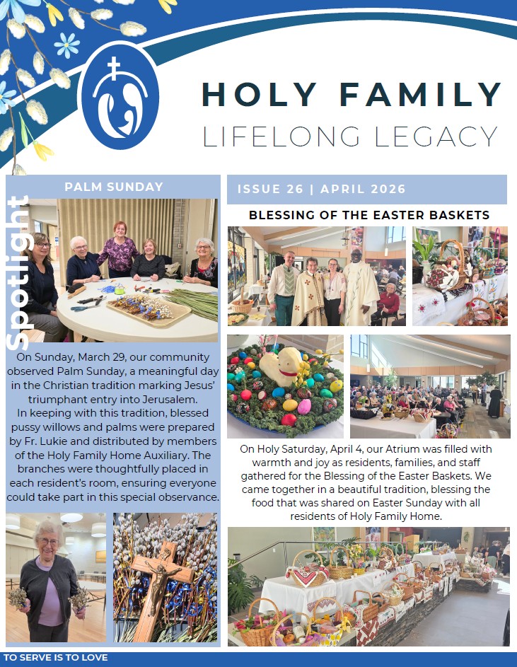 Holy Family Home is a residence for the elderly and those requiring long term care. It is a home dedicated to providing personal and health care in a loving environment based on Christian ideals and principles. Acknowledging the infinite value of every human life, we above all foster respect for the right of individuals to grow in relationship with God and to live in dignity surrounded by those who love them.